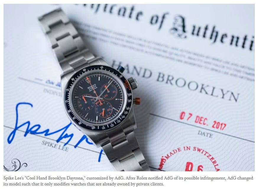 The brand has long disliked aftermarket customizers. In a previous case, Rolex sued a California watch customizer called laCalifornienne for counterfeiting, successfully arguing that the colorful dials, reworked cases and crystals diminished the brand and were likely to confuse customers.